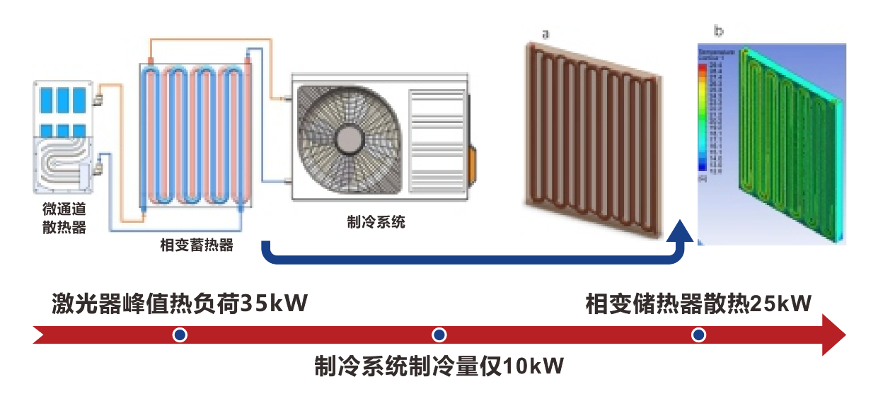 对于激光器等瞬时发热功率非常高、工作时间短、准备时间长的设备,工作时间和准备时间循环交替进行。由于设备峰值制冷功率要求高,如采用单一制冷机组,其制冷量极高,机组体积重量过于庞大。